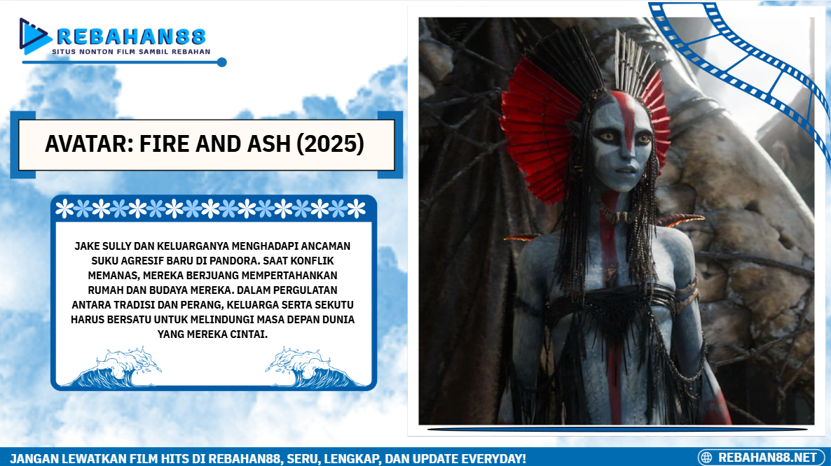 REBAHAN88 kembali menghadirkan film petualangan fiksi ilmiah spektakuler yang penuh konflik budaya dan aksi luar biasa melalui Avatar: Fire and Ash. Film ini membawa penonton kembali ke dunia Pandora yang menakjubkan, di mana damai yang rapuh terus diuji oleh bahaya baru yang mengancam.